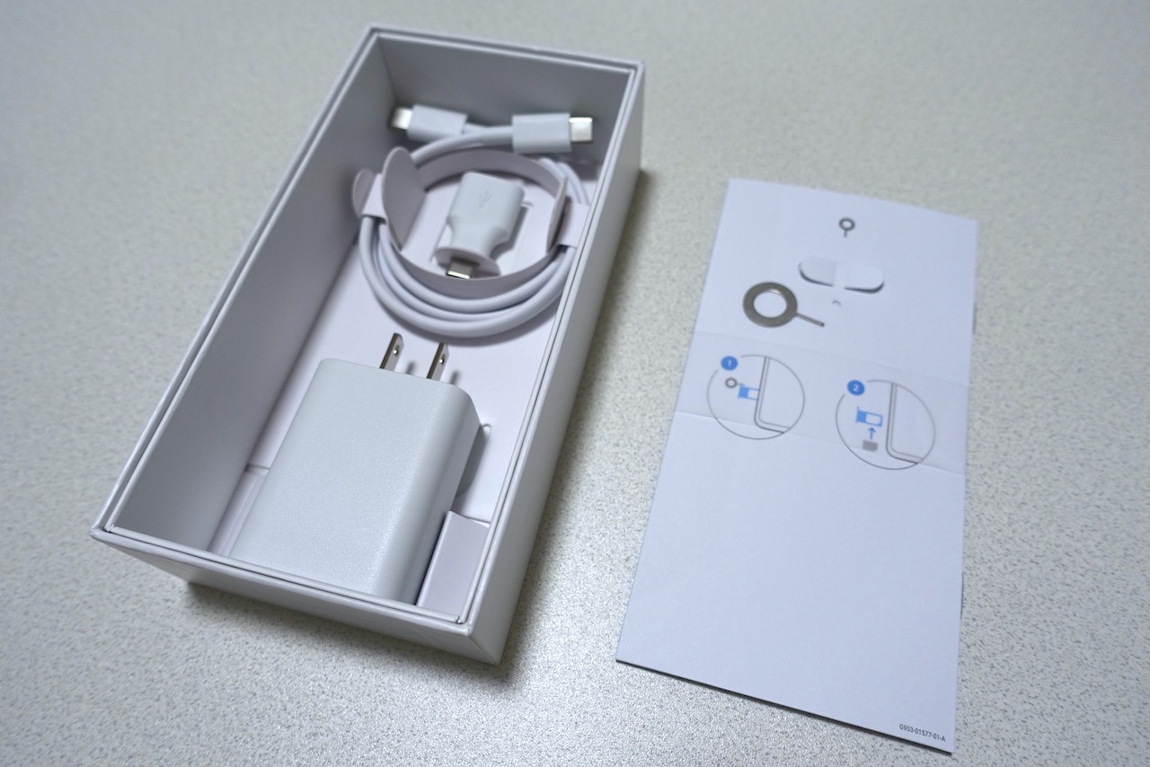 説明書の他に18W USB-C電源アダプター、充電ケーブル、クイックスイッチアダプター、SIMピンが付属されています。