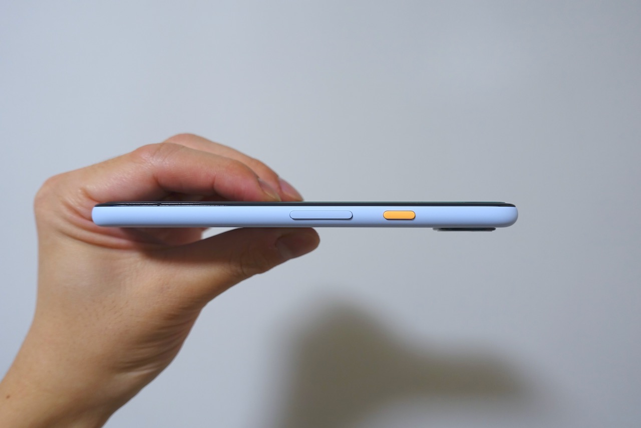 同じ機種なので、性能やサイズなどは全く同じ。Pixel a4は電源ボタンの色だけがワンポイントで異なっていて、Just Blackはブルー、Barely Blueはオレンジ。
