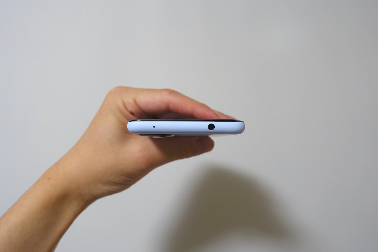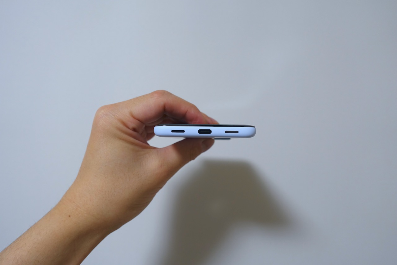 左側面にSIMスロット、右側面には電源ボタンと音量ボタンが設置されています。下部にはスピーカーとUSB-Cの充電ポート。厚さは8.2mmと薄い方に仕分けできる厚さで、カメラ部分は本体より厚くなっています。